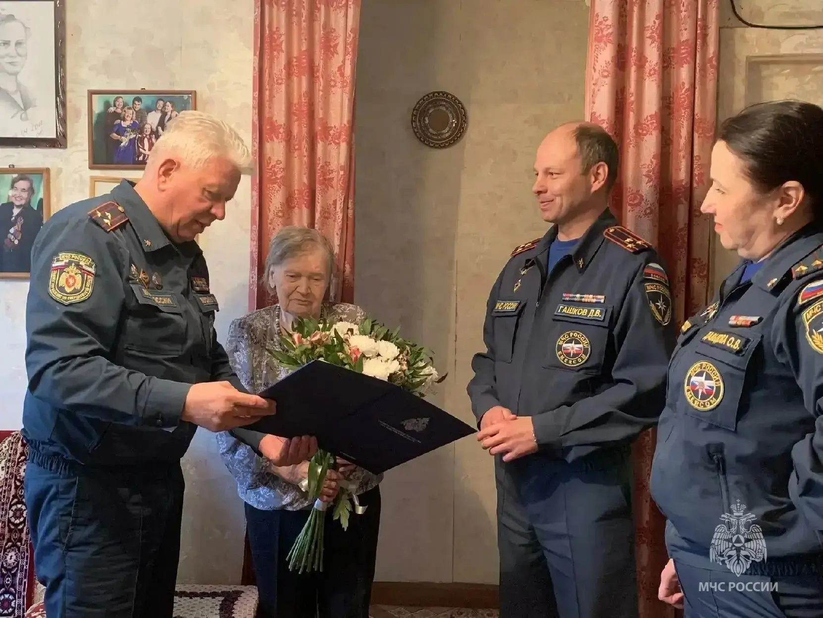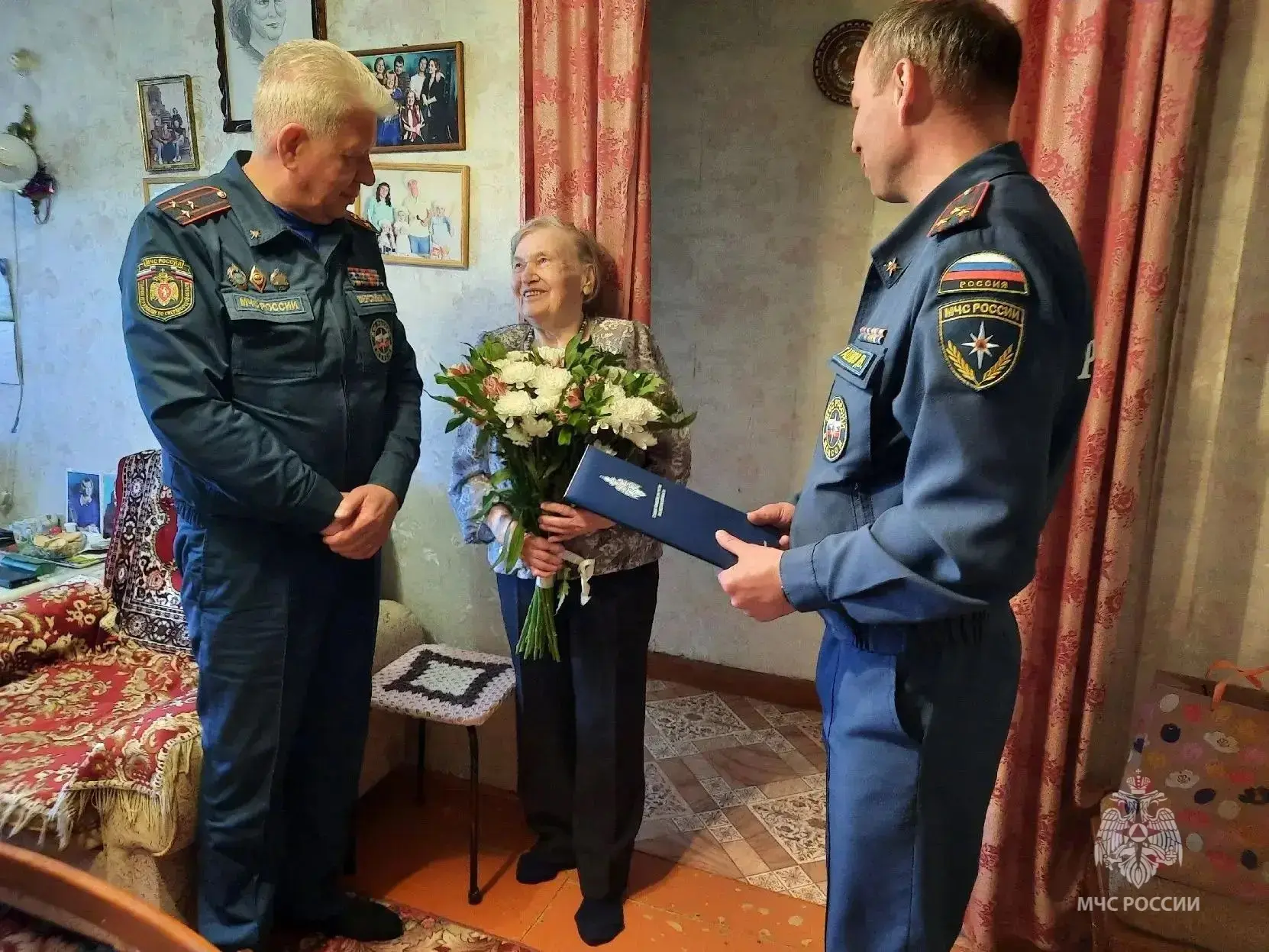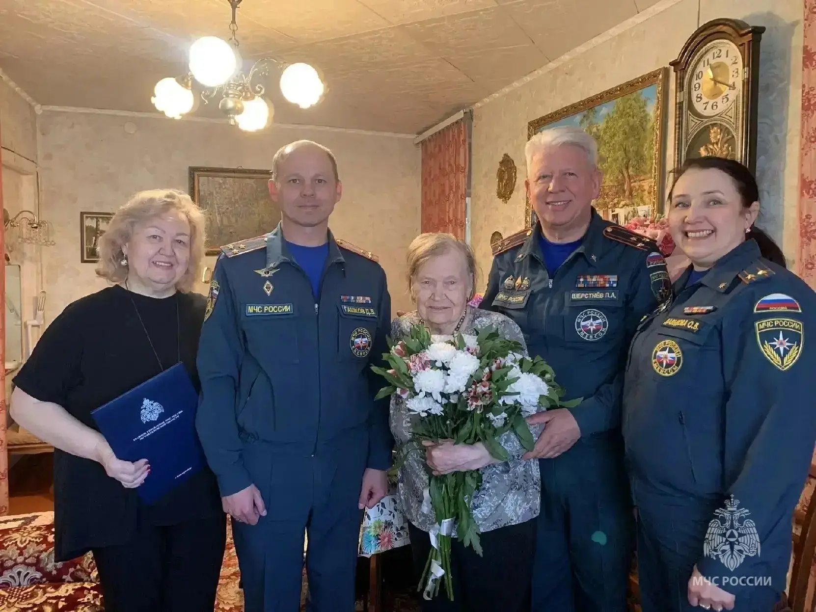 В день 95-летнего юбилея Александру Перфильевну Сакерину поздравили помощник начальника Главного управления Павел Шерстнев и начальник Екатеринбургского пожарно-спасательного гарнизона Денис Гашков.
