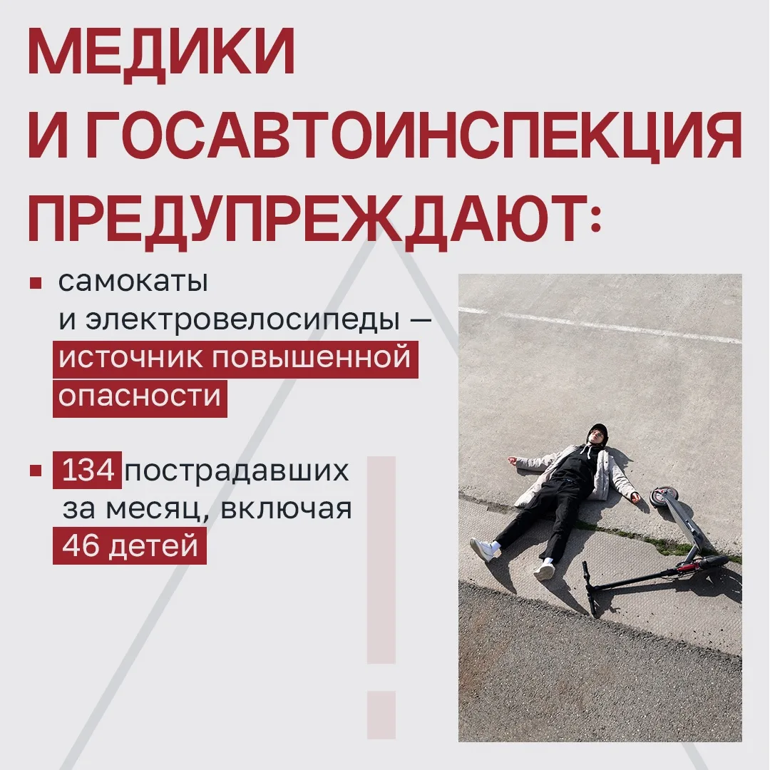 С начала весеннего сезона самокатов и других СИМ в Свердловской области за месяц зафиксировано 134 пострадавших, из них 46 детей. Почти все несовершеннолетние получили травмы, когда сами ездили на самокатах, только в одном случае самокат наехал на кого-то. Восемь человек попали в больницу, среди них был ребенок с серьезной травмой головы.