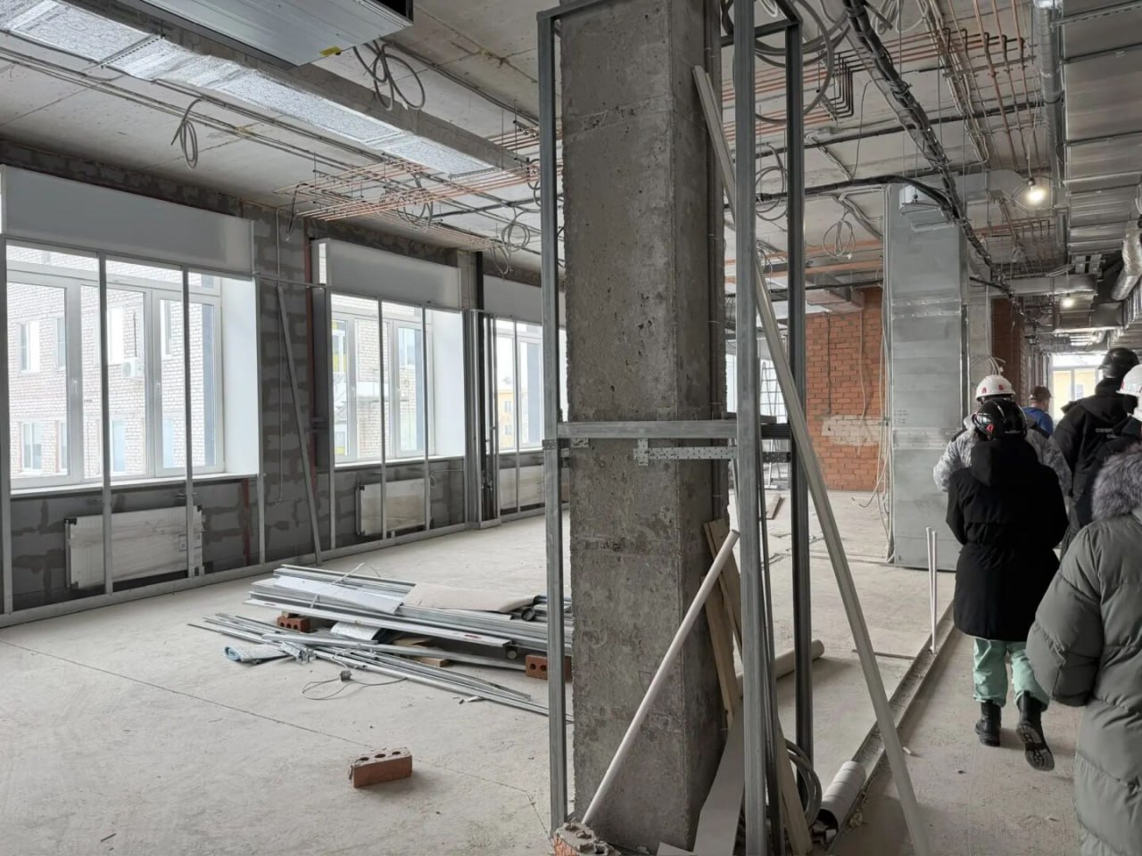 Завершается работа над окнами и витражами. Готовность фасада составляет 82%. Монтаж внутренних инженерных сетей также близок к завершению: водоснабжение и канализация готовы на 78%, отопление и вентиляция — на 86%.