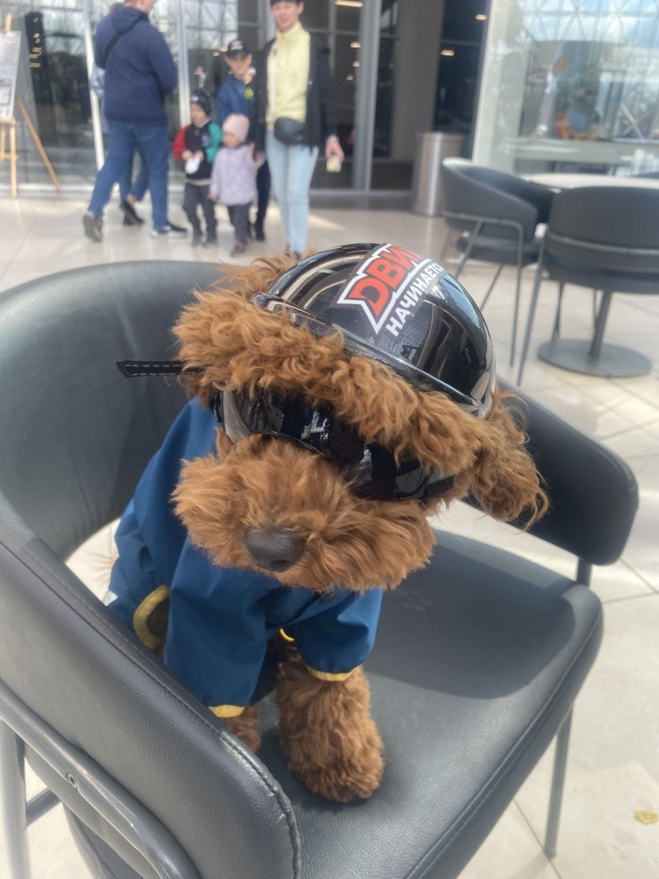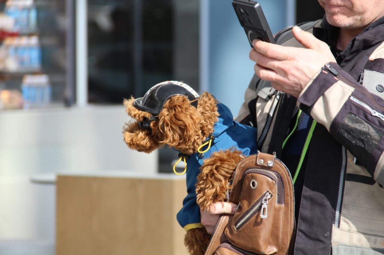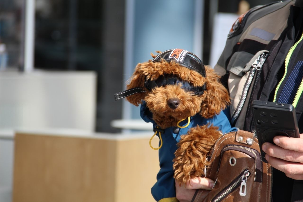 Безопасность превыше всего, поэтому хозяин, перевозя питомца на байке, снарядил его по полной: на голову песику надели шлем, а на глаза — защитные очки.