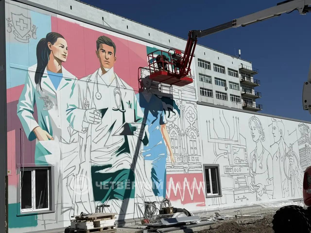 Художники завершают работу над арт-объектом на новом здании приёмного покоя городской больницы № 40. Мурал посвящён медикам, которые каждый день спасают жизни и помогают пациентам. Это часть формирующегося общественного пространства, доброжелательного и комфортного для пациентов и персонала.