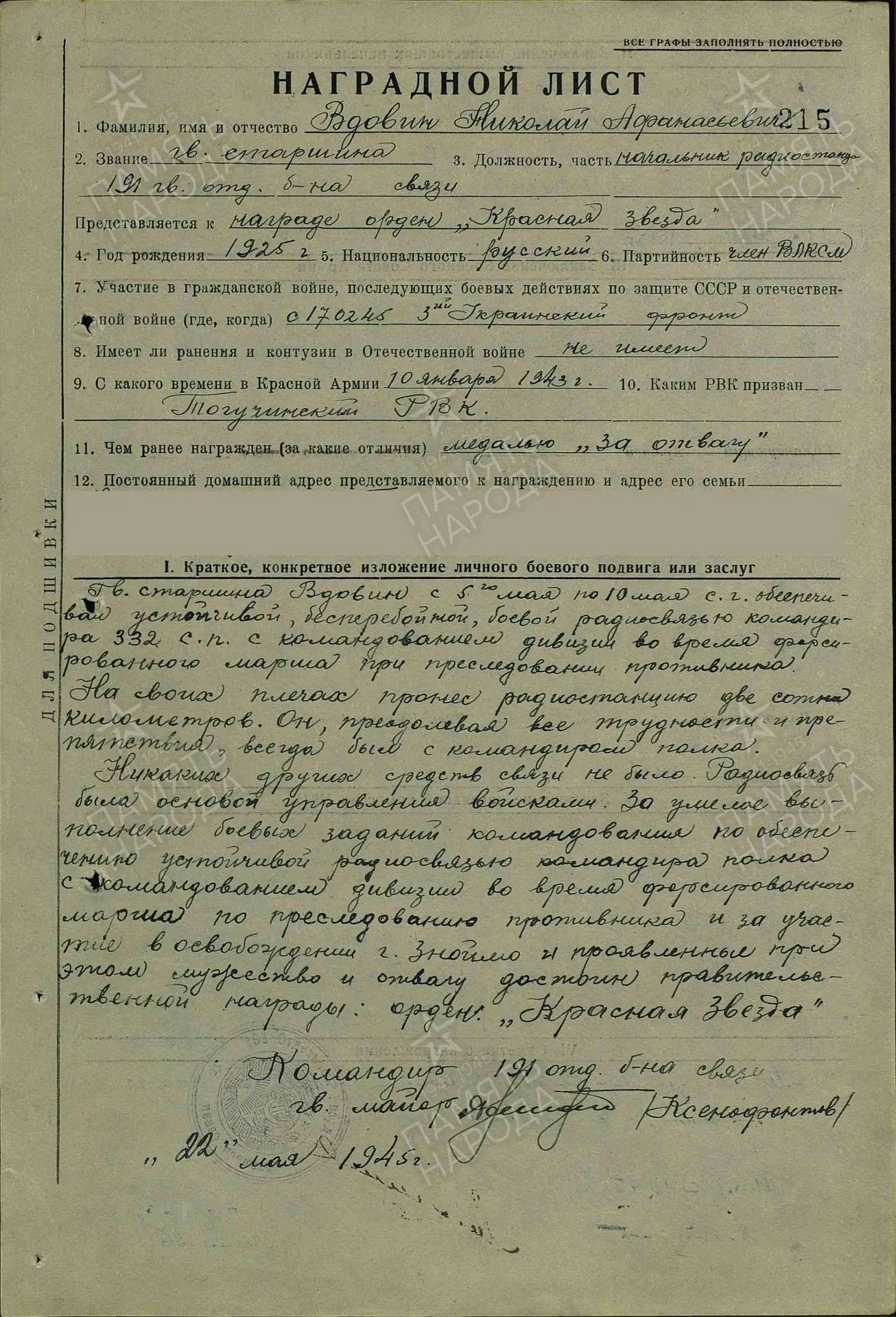 В представлении к Ордену Красной Звезды отмечено, что в мае 1945 года гвардии старшина Вдовин обеспечивал командира своего полка устойчивой, бесперебойной радиосвязью с командованием дивизии во время форсированного марша при преследовании противника: «На своих плечах пронес радиостанцию две сотни километров. Преодолевая все трудности и препятствия, всегда был с командиром полка. Никаких других средств связи не было. Радиосвязь была основой управления войсками».