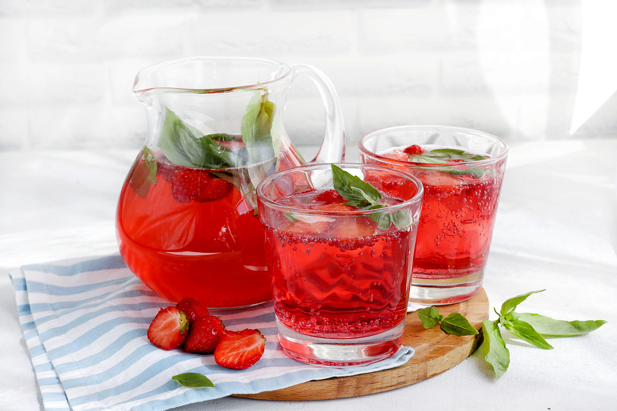 Шаг 1: Сначала очистите базилик, слегка разомните его руками, чтобы высвободились эфирные масла. Затем тщательно нарежьте клубнику на тонкие ломтики. В глубокой миске соедините базилик, клубнику, лаймовый сироп, клубничный сироп и тоник. Не забудьте добавить кубики льда для лучшего охлаждения.