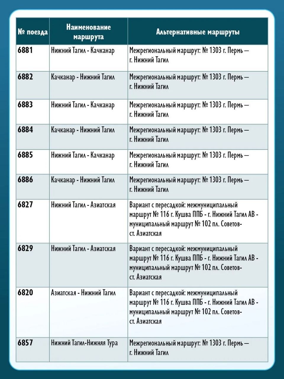 Актуальное расписание пригородных поездов доступно на сайте перевозчика, в кассах и справочных службах. Также региональный Минтранс регулярно актуализирует данные о межмуниципальных автобусных маршрутах в цифровых сервисах. Пассажиры могут подобрать удобный маршрут с пересадками в «Яндекс Картах», а также воспользоваться региональным порталом «Свердловский транспорт» (https://svrtransport.ru/).
