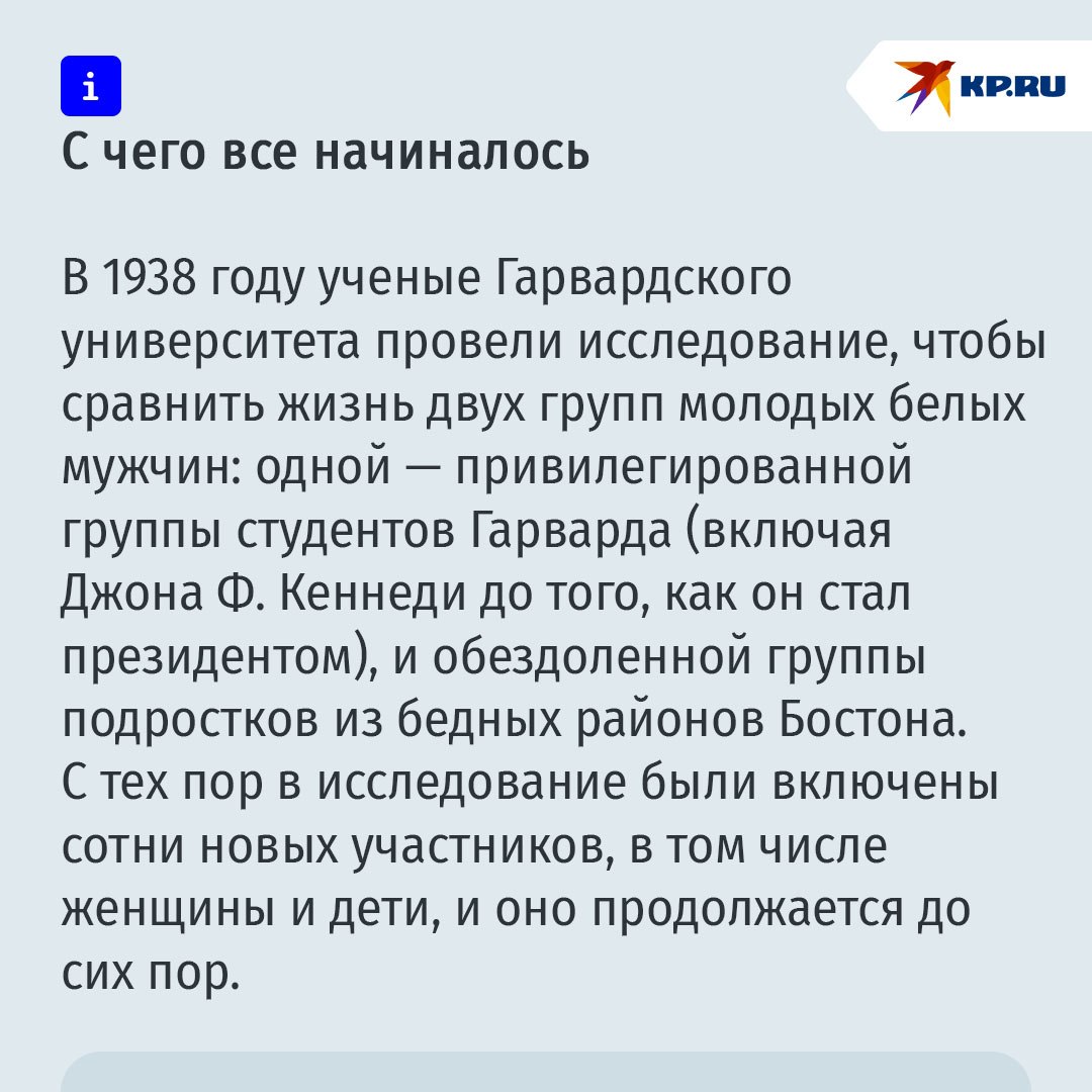 Ученые Гарвардского университета обнаружили, что не физическое здоровье, например, уровень холестерина, лучше всего предсказывало продолжительность жизни человека, а удовлетворенность отношениями с окружающими. Люди, наиболее довольные своим окружением друзей и семьи в среднем возрасте, были самыми здоровыми в возрасте 80 лет, реже болели и чаще выздоравливали после болезней.