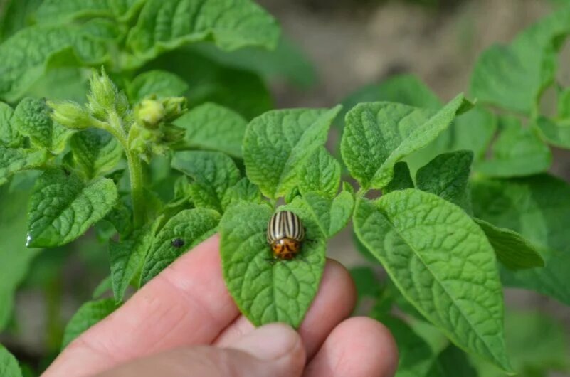 Колорадский жук представляет собой настоящую угрозу для картофельных кустов, так как он полностью уничтожает листву, оставляя лишь прожилки. Опознать появление жука не всегда просто: яйца он откладывает на нижней стороне листа, что делает их незаметными. Личинки, появляющиеся через 14 дней, активно поедают листья, что значительно снижает урожайность.