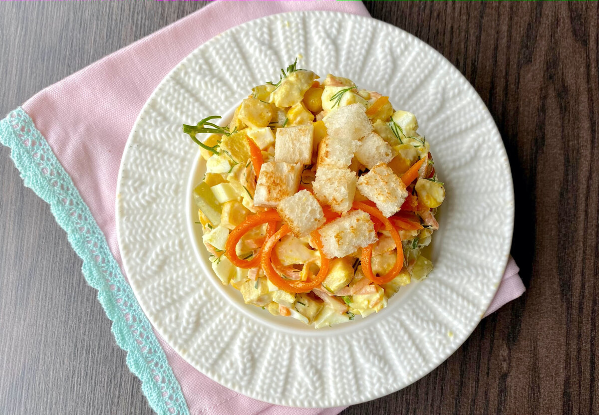 Как только мясо станет золотистым, переложите его в салатник и дайте остыть. Далее добавьте в салатник морковь по-корейски, консервированную кукурузу, нарезанные на мелкие кусочки маринованные огурцы и вареные яйца. Для усиления аромата можно добавить немного свежего укропа, но это не обязательный ингредиент.