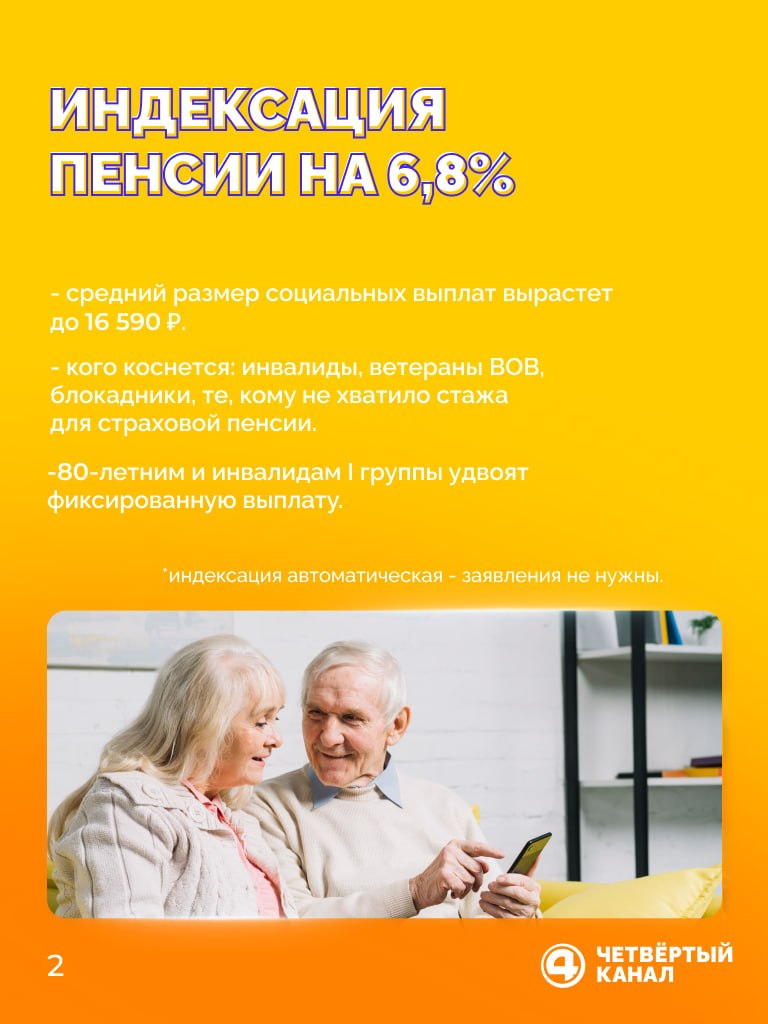 Пенсии проиндексируют на 6,8% — средний размер соцвыплат вырастет до 16 590 . Повышение коснётся инвалидов, ветеранов, блокадников и тех, кому не хватило стажа. При этом 80-летним и инвалидам I группы удвоят фиксированную выплату.