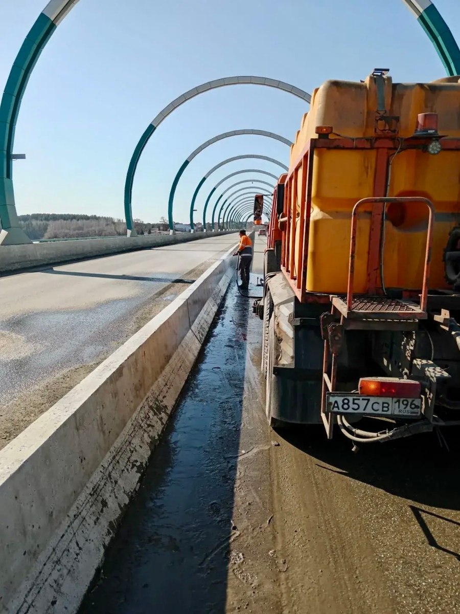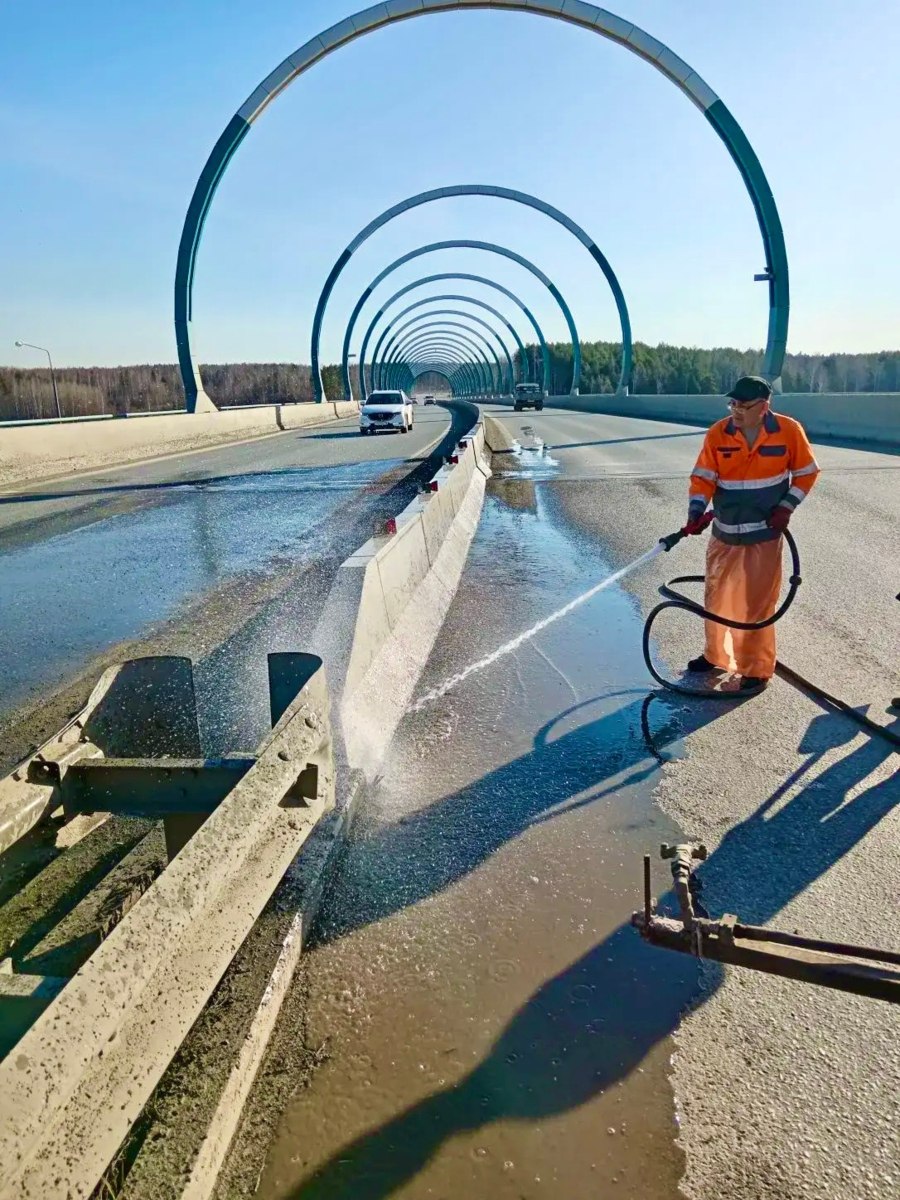 Доброе утро! Весенние работы дорожников — мойка моста.