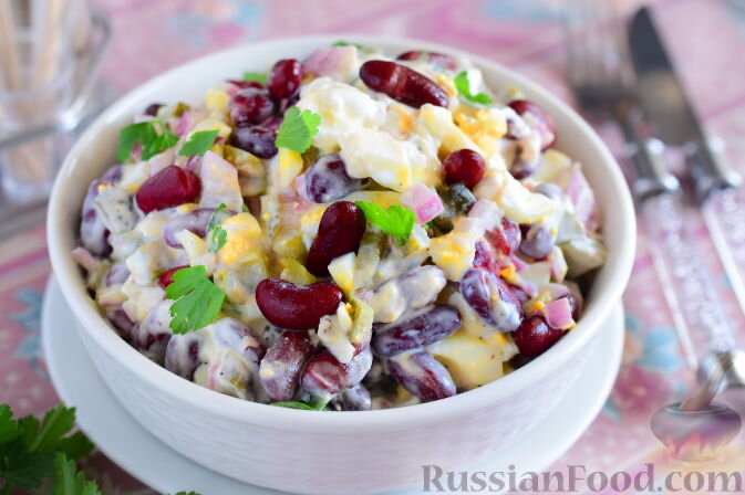 - Ингредиенты: консервированная фасоль, красный лук, яйца, маринованные огурцы, сметана, зелень, перец.