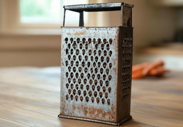 Эта железная тёрка, с кривыми зубцами и слегка повреждённой формой, может напомнить о домах с тёплыми искрами воспоминаний. Она пережила годы, полные кулинарных экспериментов, начиная от натёртой свёклы для салата «Шуба» до тёрки сыров для пиццы. За её простым дизайном и потертым видом скрывается огромная ценность.