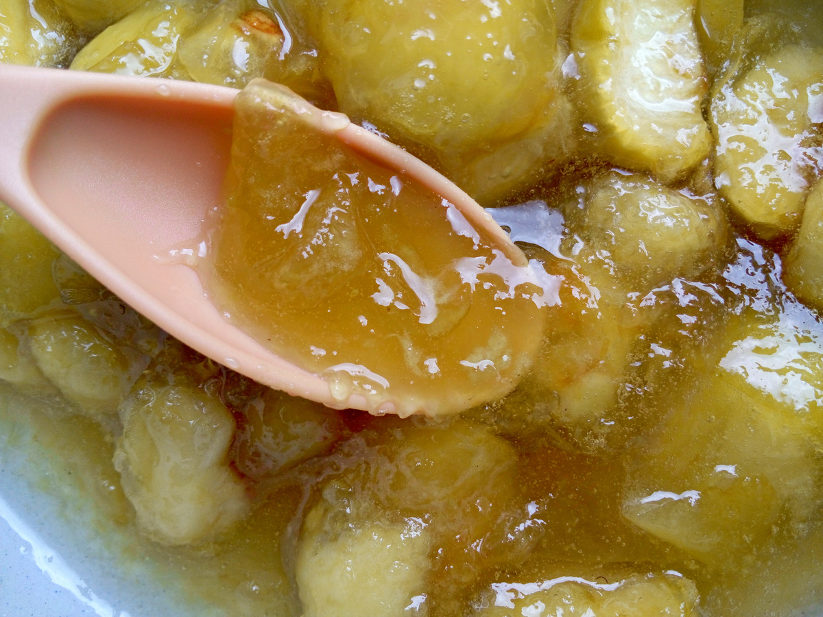 - Кожура нарезается на тонкие полоски, а мякоть резалась на кружки. После этого варится сахарный сироп с добавлением лимонной корки.