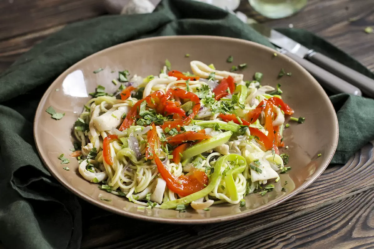 Яичная лапша с кальмаром, кабачками и маринованным перцем