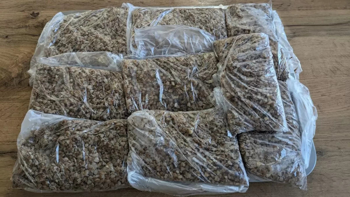 Рекомендуется фасовать крупу порциями по 120 граммов. Этого обычно достаточно на один прием пищи. Для упаковки можно использовать простые фасовочные пакеты. Например, гречка на фотографии распределена именно таким образом. Одну порцию иногда оставляют в холодильнике на завтрак следующего дня, а остальное идет в морозильник.