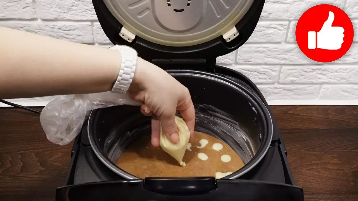 Из получившегося теста отложите две столовые ложки в отдельную чашку. В оставшуюся массу добавьте какао и тщательно перемешайте. Теперь пора наливать тесто в предварительно смазанную маслом чашу мультиварки. Чтобы кекс выглядел эффектно, аккуратно капайте белую массу на тёмную, создавая замысловатый узор.