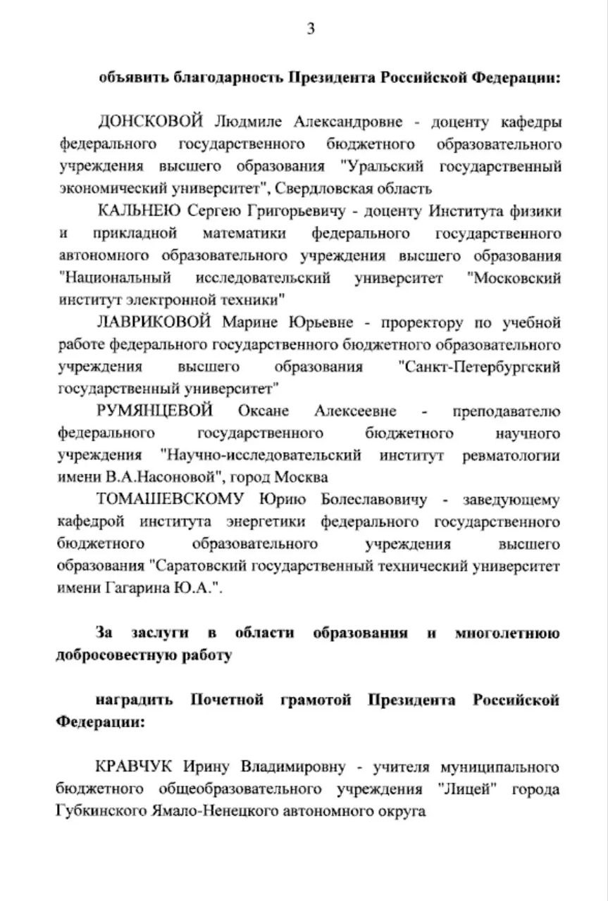Президент России Владимир Путин объявил благодарность преподавателю из Свердловской области