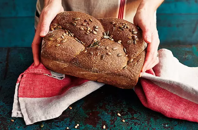 Переложите плетеное тесто в форму, накройте и дайте ему подняться еще 40-60 минут. Не забудьте разогреть духовку до 240 °C. После того как тесто подняло, смажьте его водой и посыпьте семенами тыквы и подсолнечника. Выпекайте хлеб в предварительно разогретой духовке в течение 35 минут при температуре 220 °C.