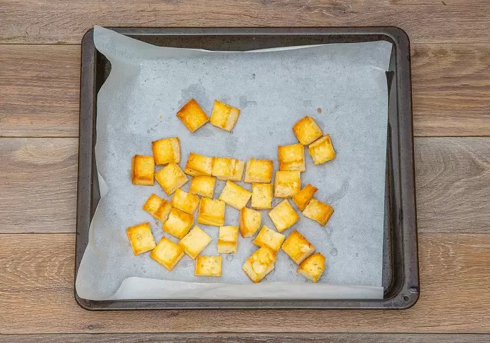 Разогрейте духовой шкаф до 200°С. Чиабатту нарежьте на небольшие кусочки, положите на противень, сбрызните оливковым маслом и запекайте в течение 5 минут.