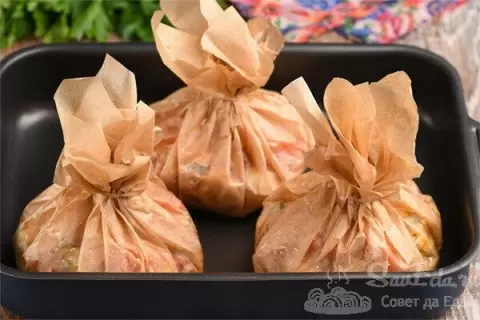 Куриное мясо смешивается с маслом и специями, а овощи подготавливаются аналогичным образом. На большом куске пергамента выкладывают лук, сверху курицу и овощи. Завязываются мешочки при помощи кулинарной нити и запекаются в духовке при температуре 180 градусов около 40 минут. Это блюдо порадует своих гостей и близких невероятной сочностью.