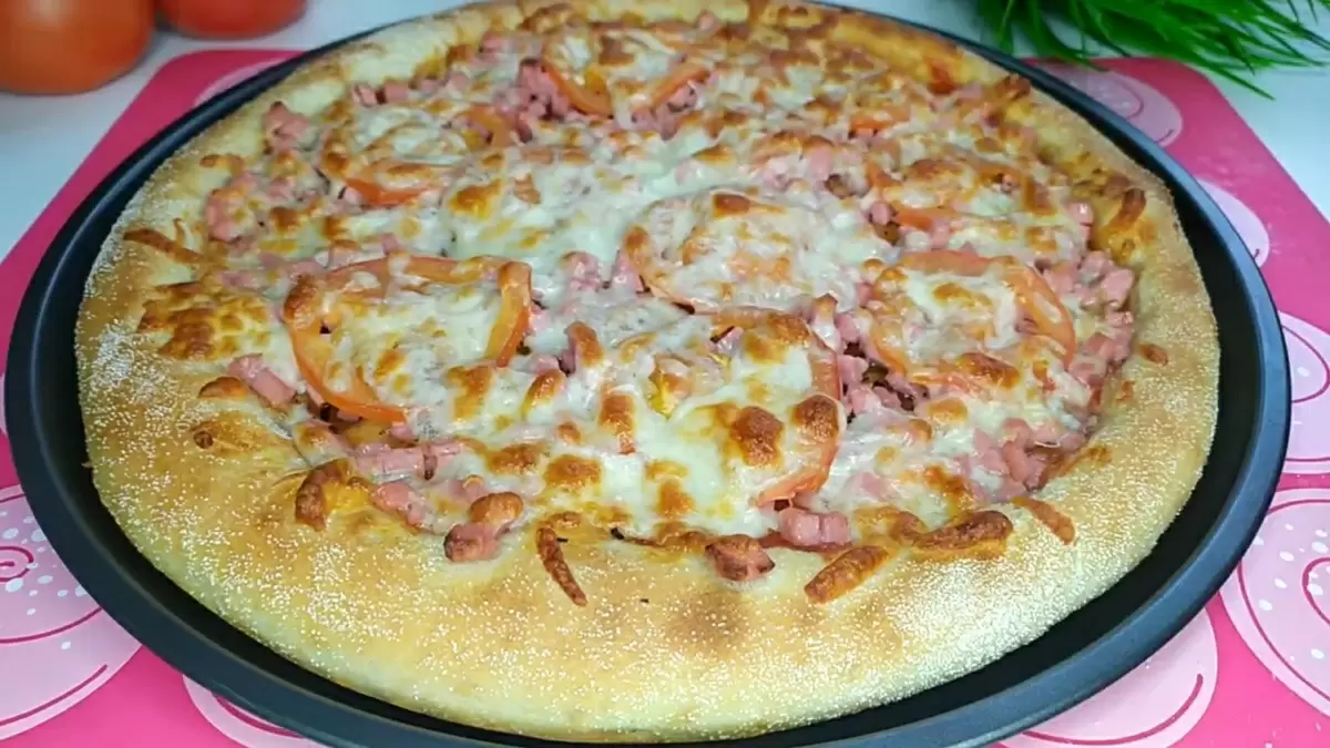 После поднятия теста, следует присыпать форму манкой и выложить тесто, придавая ему круглую форму. Далее лепешку смазывают кетчупом, поверх добавляется нарезанная колбаса, помидоры и тертый сыр. Начинку можно варьировать по вкусу: используйте все, что найдется в холодильнике!