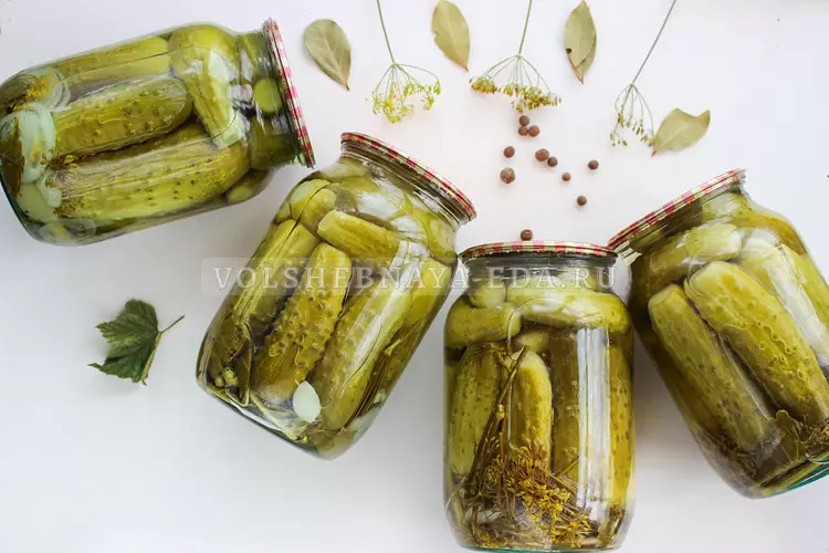 Огурцы предварительно замачивают в холодной воде на три часа и тщательно моют, после чего срезают кончики. Их необходимо укладывать в банки плотно, начиная с крупных и заканчивая мелкими.