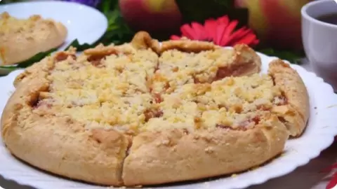 После охлаждения теста раскатать круг диаметром 30-35 см. На противень, застеленный бумагой, выложить тесто, посыпать крахмалом, затем распределить начинку, оставляя около 1,5 см от краев. Закрыть края и посыпать крошкой. Выпекать при 180°C около 30 минут.