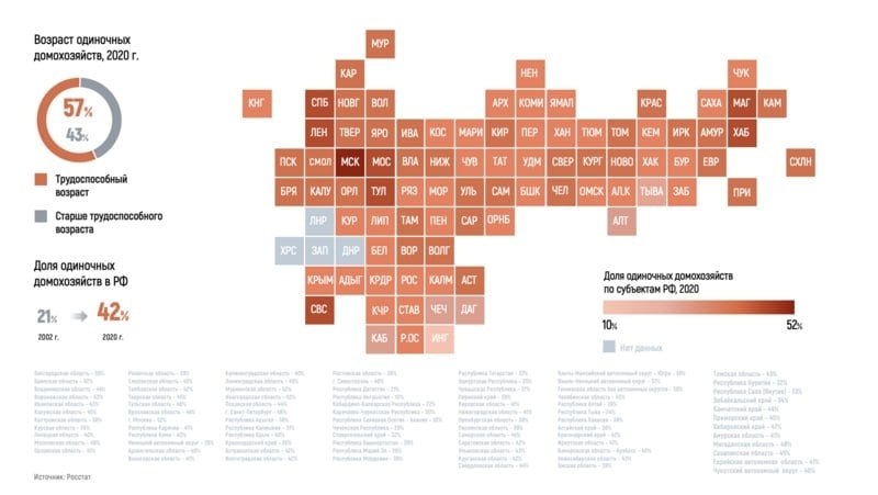 Количество одиноких домохозяйств в России стремительно растёт. Если в 2002 году таких было каждое пятое, то к 2020 году их доля превысила 40%. Почти половина россиян (данные опроса) подтверждают: в последние годы одиноких людей вокруг стало больше.