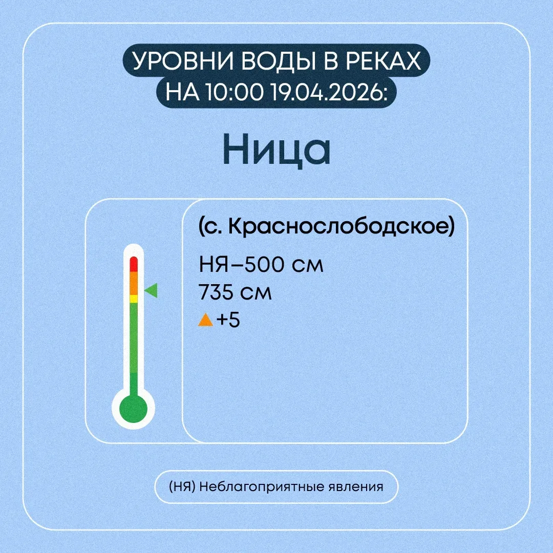 Уровень воды в р. Ница (с. Краснослободское) за сутки повысился на 5 см и составляет 735 см. Временно закрыто движение по низководному мосту у с. Елань, временно ограничено автотранспортное сообщение с д. Яр. Организована лодочная переправа. Закрыто движение по низководному мосту у с. Городище, временно ограничено автотранспортное сообщение с 2-мя н.п. (д. Боровикова, д. Красный Бор). Организована паромная переправа.