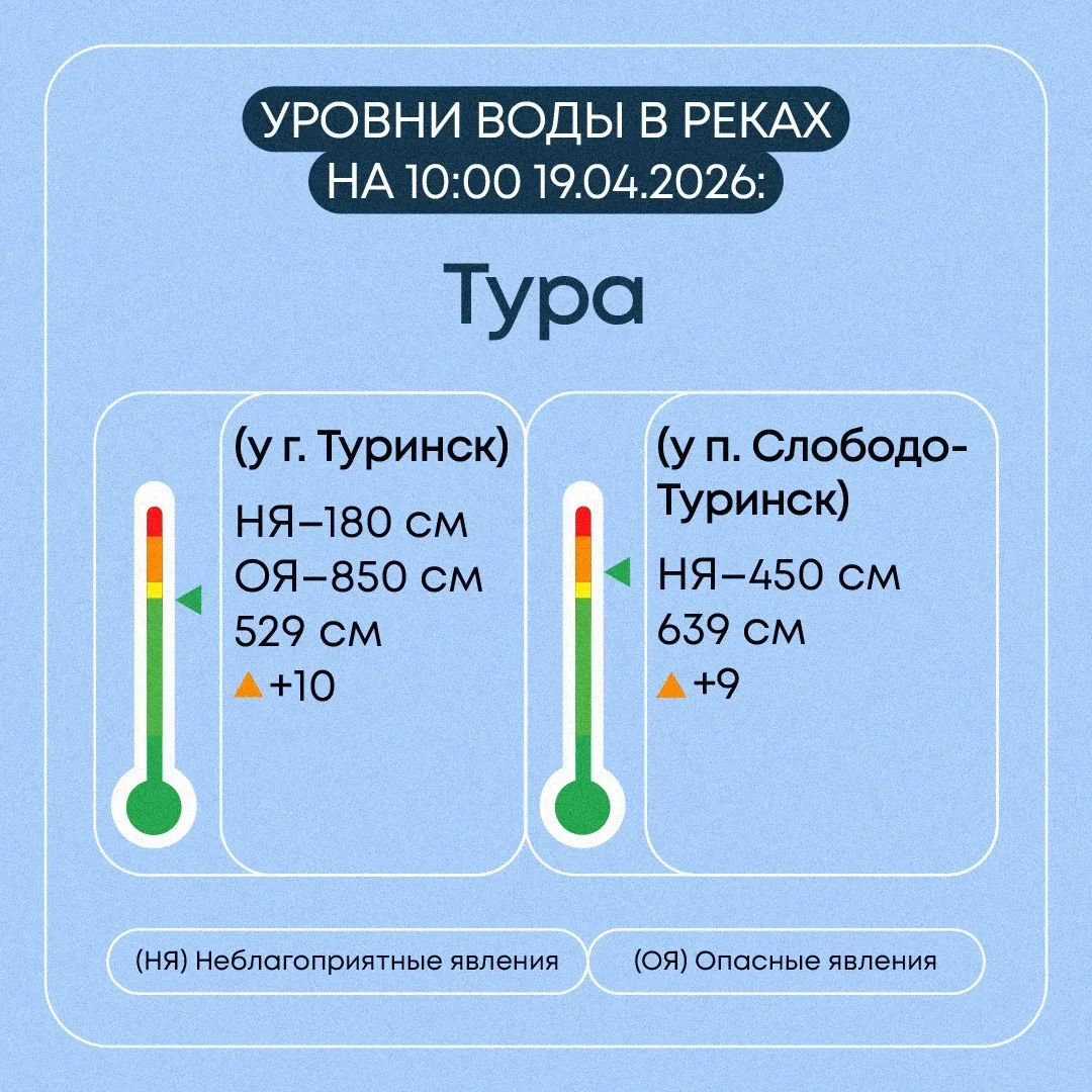 Уровень воды в р. Тура за сутки повысился на 9 см и составляет 639 см (НЯ — 450 см). Подтоплен низководный автомобильный мост на р. Тура в с. Туринская Слобода, временно ограничено автотранспортное сообщение с 9-ю населенными пунктами. Подтоплен низководный автомобильный мост у с. Куминовское, ограничено сообщение с 2-мя н.п. (с. Куминовское и д. Барбашина). Затоплен мост у д. Макуй, ограничено сообщение с д. Макуй. Организована работа паромной и лодочной переправы.