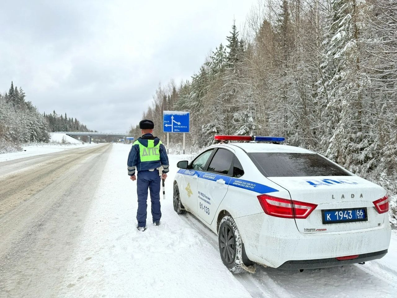 Днём 19 апреля на 223-м километре автодороги Екатеринбург - Серов температура воздуха опустилась до -3 градусов. Идёт мелкий снег, проезжая часть покрыта рыхлым снежным покровом. На месте дежурят экипажи ДПС.
