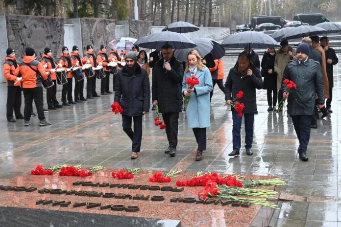 Дипломаты почтили память героев Великой Отечественной войны минутой молчания и возложили цветы к Вечному огню на Широкореченском военно-мемориальном комплексе.