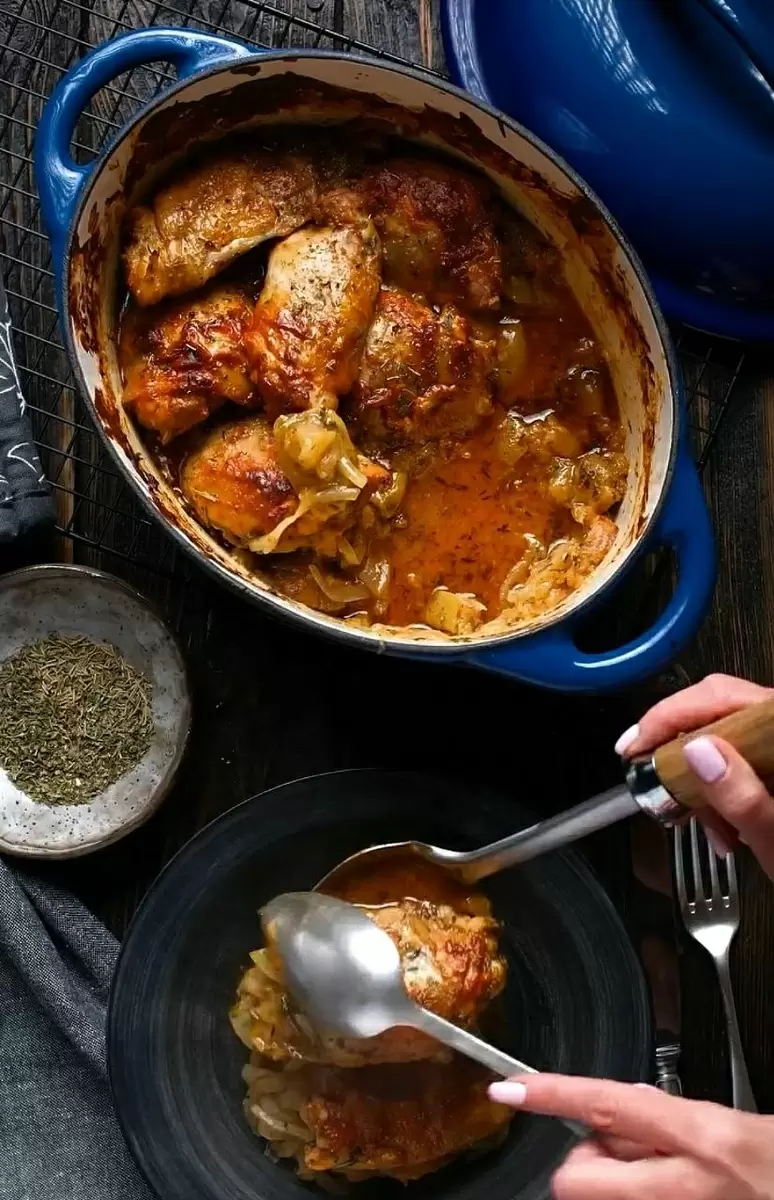 Нежные куриные бёдра в сочетании с карамелизированным луком и сладко-кислыми яблоками образуют настоящий кулинарный шедевр, при этом не требуя больших усилий. Вся суть — в минимализме: всё в одной форме, а значит, меньше мытья посуды и больше времени для отдыха.