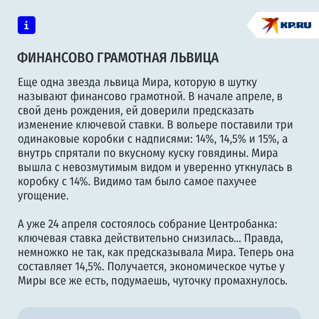 В Екатеринбурге, что ни зверь, то оракул. Есть, например, в уральской столице традиция - в конце зимы африканские ежи предсказывают, какой будет весна. Солнечной или дождливой. А на днях, львица гадала на процентную ставку…