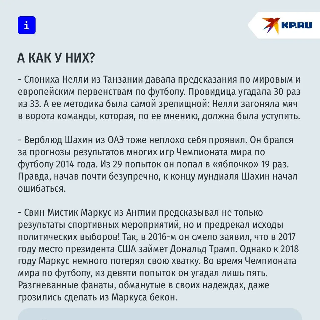 Но сам тренд на животных предсказателей появился еще в 2008 году, во время Чемпионата Европы по футболу. Тогда фанаты ради шутки доверили определять фаворитов осьминогу Паулю из немецкого зоопарка. «Нострадамус с щупальцами» безошибочно определил итог четырех матчей из шести. А по всему миру начали появляться последователи моллюска.