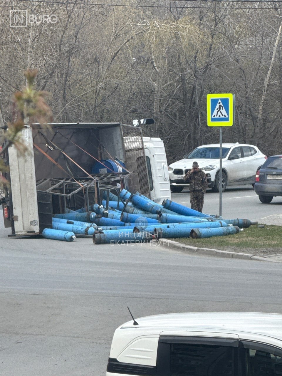 В Екатеринбурге перевернулся грузовик с кислородными баллонами
