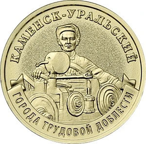 Банк России выпустит её 4 мая в серии «Города трудовой доблести». На монете расположено рельефное изображение фрагмента художественного оформления стелы «Город трудовой доблести». По окружности имеются надписи - «КАМЕНСК-УРАЛЬСКИЙ» и «ГОРОДА ТРУДОВОЙ ДОБЛЕСТИ».
